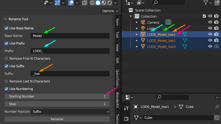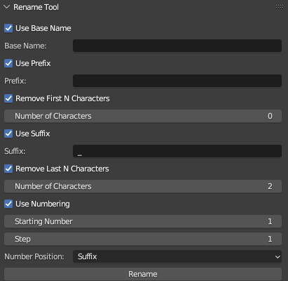 With the Rename Tool, you can set a base name for all selected objects, add prefixes or suffixes to their names, remove unwanted characters from the beginning or end of object names, and enable sequential numbering, starting from any number you choose, with the flexibility to set the numbering as a prefix or suffix.
